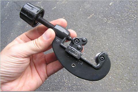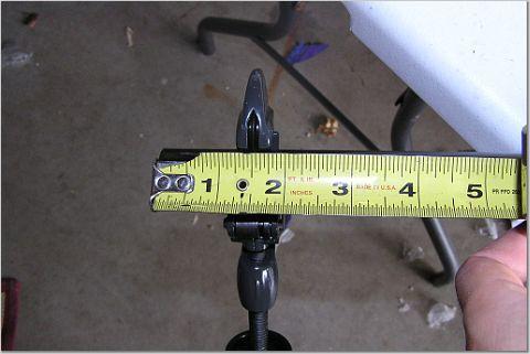 Measure out how much you want to cut off and attach the pipe cutter. Initially I took off only 1 1/2 " as shown here. Later I went back and took off another 1/2 ". I'm really happy with the table height and suggest you cut off about 2" as well. If you're not sure start small and cut more off later. Tighten the knob on the pipe cutter and then turn it around the pipe. Tighten turn, Tighten turn, Tighten turn, eventually you'll get all the way through. The pipe cutter leaves a nice clean edge. Do this for all 4, then put the feet back on.