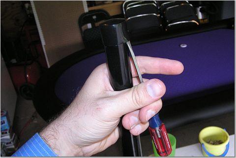 You'll need to cut the legs down a bit to get the table at a proper height. First, use a small screwdriver to loosen the plastic feet. Gently go around the perimeter a couple of times and they should pull off easily.