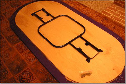 Take your newly cut legs and arrange them on the underside of the table. You'll want the feet of the legs to almost be touching. Your initial thought will be to put the legs as far to the ends of the table as possible. Doing this could leave a sag in the middle of the table. Take some time and figure out how the legs will open. I installed mine backwards a couple of times. Make sure the screws you use to attach to the surface are not more then 1 1/4" long. Think about how you would feel if a big screw came up through your felt. I think the underside of the playing surface, where the legs are attached, is at about 27", the top of the rail is about 30 1/4".