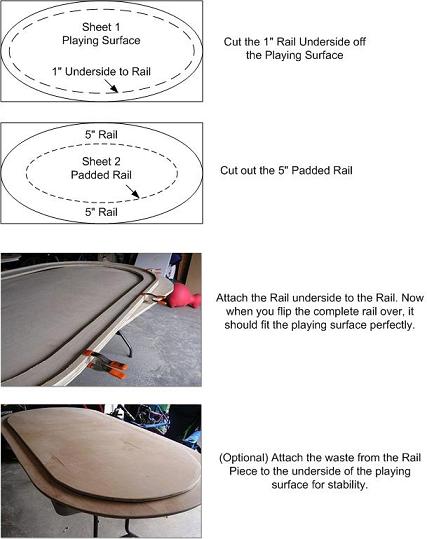 You'll then upholster this piece you created and place it back down on the playing surface. The 1" ring should line up perfectly and fit snug on the playing surface because it was once part of this piece of wood. This will keep the rail firmly in place with no real need to attach it with bolts or screws, although some people choose to attach it.