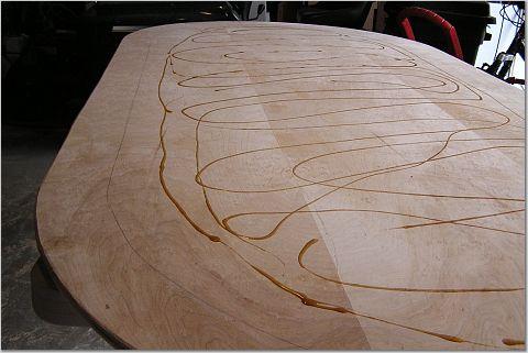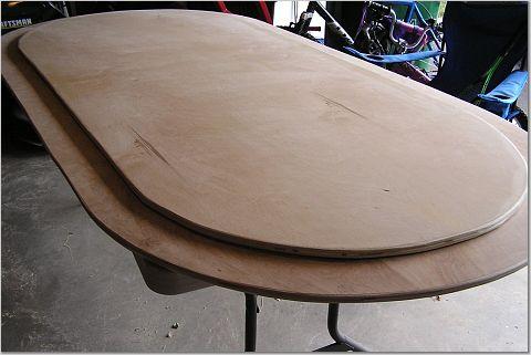 I decided to attach the smaller oval piece that we cut the 5" rail from to the bottom of the playing surface. It's an optional step but one that I think adds some good stability and weight to the table. I took some time and measured it out to make sure this piece was as centered as possible. I traced a line and took the smaller piece off.