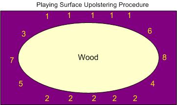 Get on the floor underneath the table and start folding over and stapling the slack on the length of one side. (See procedure diagram below) Don't worry about wrinkles at this time. Just try to keep the underside neat and consistent. The slack ended up almost directly against the second oval of wood I added for stability.